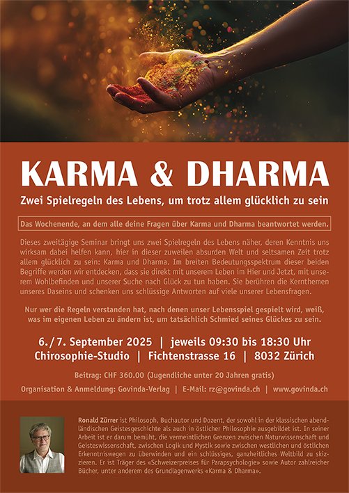 Dieses zweitägige Seminar bringt uns zwei Spielregeln des Lebens näher, deren Kenntnis uns wirksam dabei helfen kann, hier in dieser zuweilen absurden Welt und seltsamen Zeit trotz allem glücklich zu sein: Karma und Dharma. Im breiten Bedeutungsspektrum dieser beiden Begriffe werden wir entdecken, dass sie direkt mit unserem Leben im Hier und Jetzt, mit unserem Wohlbefinden und unserer Suche nach Glück zu tun haben. Sie berühren die Kernthemen unseres Daseins und schenken uns schlüssige Antworten auf viele unserer Lebensfragen.